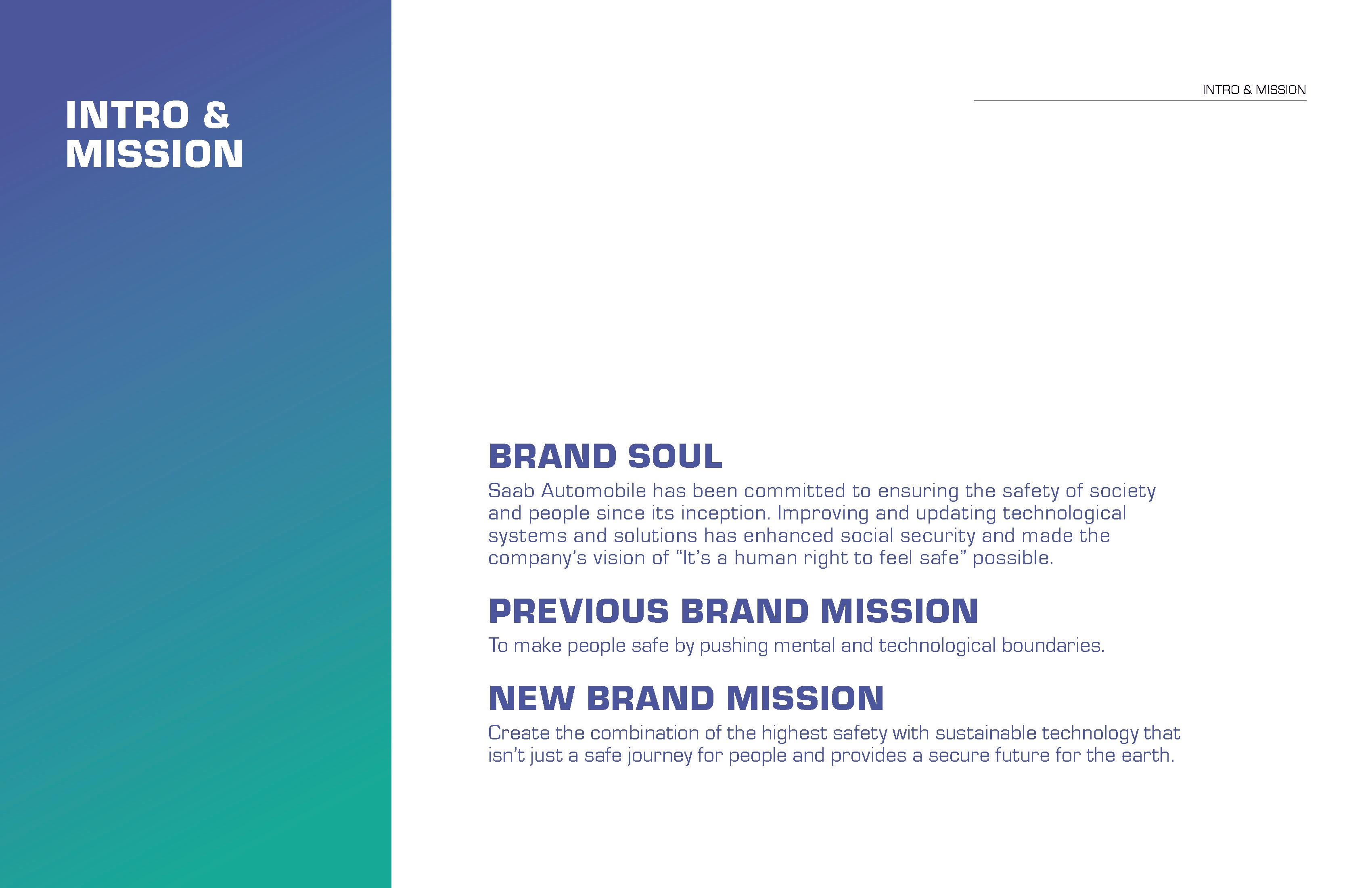 this project re-brands a non-existing brand on the market and incorporates new design elements to the brand. saab automobile has been committed to ensuring the safety of society and people since its inception. improving and updating technological systems and solutions has enhanced social security and made the company’s vision of “it’s a human right to feel safe” possible. the new brand mission is to create the combination of the highest safety with sustainable technology that isn’t just a safe journey for people and provides a secure future for the earth.